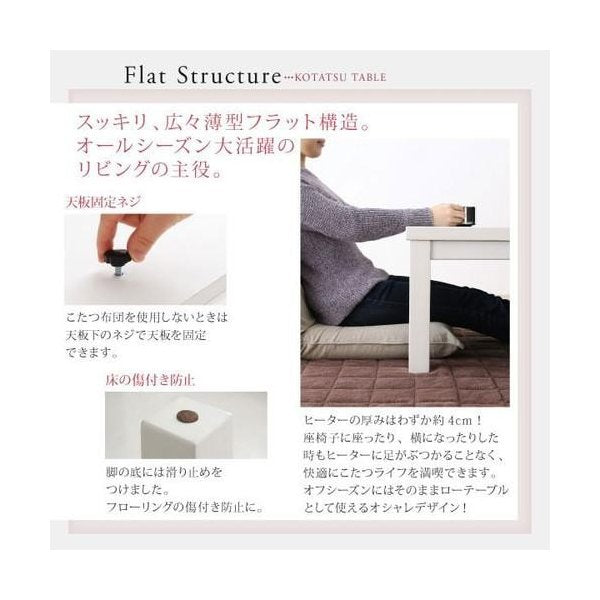 なお、滑り止め加工をしておりません。滑りやすい場合は、滑り止めシートなどの使用をおすすめします。また、床暖房に対応しております。