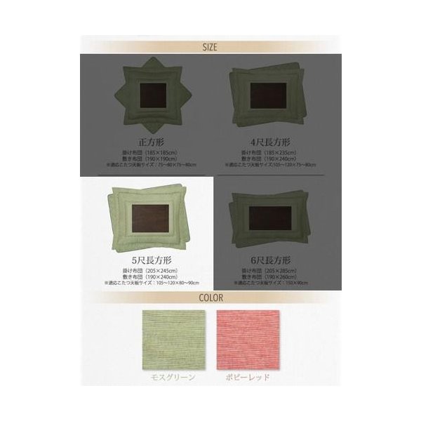 ・6尺長方形:掛け布団(205 285cm)、敷き布団(190 260cm)