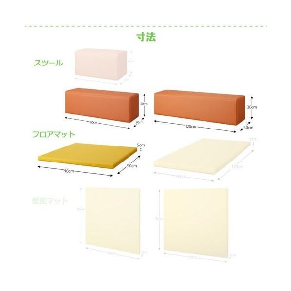 スツール 商品三辺 W60:幅60 奥行30 高さ30cm W90:幅90 奥行30 高さ30cm W120:幅120 奥行30 高さ30cm 重量 W60:5.5kg W90:7.9kg W120:10.5kg 販売用完成商品材料種類 【中材】ウレタンフォーム、合板【生地】表地:合成皮革 裏地:ポリエステル100% 販売用生産・製造国 日本 販売用組立・完成品区分 完成品 注意情報 ※サイズ・重量は概算です。 ※実際の商品の色にできるだけ近づけるよう撮影を行っておりますが、商品色はご使用のモニターによって実際の明るさや色と多少異なって見える場合がございます。※仕様は予告なく変更になる場合がございます。予めご了承下さい。 梱包サイズ W60:キッズプレイマット 横幅:62cm 高さ:32cm 奥行:32cm 6kg W90:キッズプレイマット 横幅:92cm 高さ:32cm 奥行:32cm 8kg W120:キッズプレイマット 横幅:122cm 高さ:32cm 奥行:32cm 11kgフロアマット 商品三辺 W90:幅90 奥行90 高さ5cm W60:幅60 奥行120 高さ5cm 重量 W90:8.3kg W60:7.2kg 販売用完成商品材料種類 【中材】ウレタンフォーム、合板【生地】表地:合成皮革 裏地:ポリエステル100% 販売用生産・製造国 日本 販売用組立・完成品区分 完成品 注意情報 ※サイズ・重量は概算です。 ※実際の商品の色にできるだけ近づけるよう撮影を行っておりますが、商品色はご使用のモニターによって実際の明るさや色と多少異なって見える場合がございます。※仕様は予告なく変更になる場合がございます。予めご了承下さい。 梱包サイズ W90:キッズプレイマット 横幅:92cm 高さ:7cm 奥行:92cm 9kg W60:キッズプレイマット 横幅:62cm 高さ:7cm 奥行:122cm 8kg壁面マット 商品三辺 W90:幅90 奥行5 高さ90cm W120:幅120 奥行5 高さ90cm 重量 W90:8.3kg W120:10.6kg 販売用完成商品材料種類 【中材】ウレタンフォーム、合板【生地】表地:合成皮革 裏地:ポリエステル100% 販売用生産・製造国 日本 販売用組立・完成品区分 完成品 注意情報 ※サイズ・重量は概算です。 ※実際の商品の色にできるだけ近づけるよう撮影を行っておりますが、商品色はご使用のモニターによって実際の明るさや色と多少異なって見える場合がございます。※仕様は予告なく変更になる場合がございます。予めご了承下さい。 梱包サイズ W90:キッズプレイマット 横幅:92cm 高さ:92cm 奥行:7cm 9kg W120:キッズプレイマット 横幅:122cm 高さ:92cm 奥行:7cm 11kg