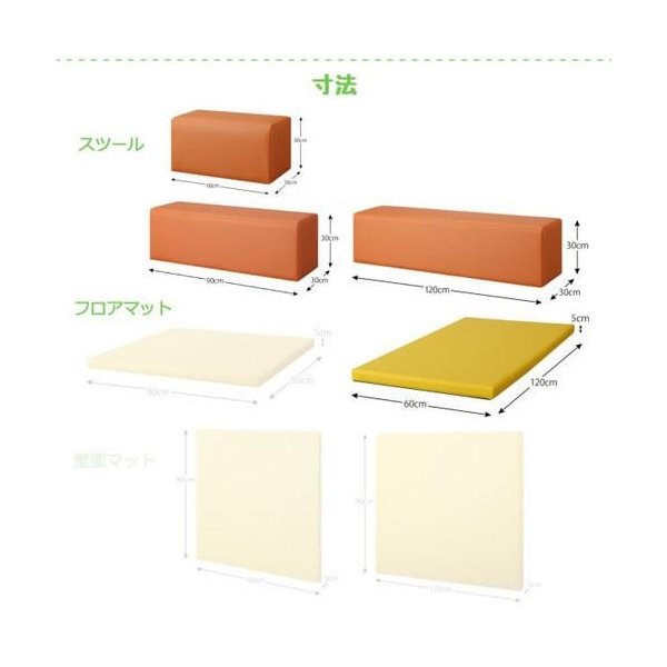 スツール 商品三辺 W60:幅60 奥行30 高さ30cm W90:幅90 奥行30 高さ30cm W120:幅120 奥行30 高さ30cm 重量 W60:5.5kg W90:7.9kg W120:10.5kg 販売用完成商品材料種類 【中材】ウレタンフォーム、合板【生地】表地:合成皮革 裏地:ポリエステル100% 販売用生産・製造国 日本 販売用組立・完成品区分 完成品 注意情報 ※サイズ・重量は概算です。 ※実際の商品の色にできるだけ近づけるよう撮影を行っておりますが、商品色はご使用のモニターによって実際の明るさや色と多少異なって見える場合がございます。※仕様は予告なく変更になる場合がございます。予めご了承下さい。 梱包サイズ W60:キッズプレイマット 横幅:62cm 高さ:32cm 奥行:32cm 6kg W90:キッズプレイマット 横幅:92cm 高さ:32cm 奥行:32cm 8kg W120:キッズプレイマット 横幅:122cm 高さ:32cm 奥行:32cm 11kgフロアマット 商品三辺 W90:幅90 奥行90 高さ5cm W60:幅60 奥行120 高さ5cm 重量 W90:8.3kg W60:7.2kg 販売用完成商品材料種類 【中材】ウレタンフォーム、合板【生地】表地:合成皮革 裏地:ポリエステル100% 販売用生産・製造国 日本 販売用組立・完成品区分 完成品 注意情報 ※サイズ・重量は概算です。 ※実際の商品の色にできるだけ近づけるよう撮影を行っておりますが、商品色はご使用のモニターによって実際の明るさや色と多少異なって見える場合がございます。※仕様は予告なく変更になる場合がございます。予めご了承下さい。 梱包サイズ W90:キッズプレイマット 横幅:92cm 高さ:7cm 奥行:92cm 9kg W60:キッズプレイマット 横幅:62cm 高さ:7cm 奥行:122cm 8kg壁面マット 商品三辺 W90:幅90 奥行5 高さ90cm W120:幅120 奥行5 高さ90cm 重量 W90:8.3kg W120:10.6kg 販売用完成商品材料種類 【中材】ウレタンフォーム、合板【生地】表地:合成皮革 裏地:ポリエステル100% 販売用生産・製造国 日本 販売用組立・完成品区分 完成品 注意情報 ※サイズ・重量は概算です。 ※実際の商品の色にできるだけ近づけるよう撮影を行っておりますが、商品色はご使用のモニターによって実際の明るさや色と多少異なって見える場合がございます。※仕様は予告なく変更になる場合がございます。予めご了承下さい。 梱包サイズ W90:キッズプレイマット 横幅:92cm 高さ:92cm 奥行:7cm 9kg W120:キッズプレイマット 横幅:122cm 高さ:92cm 奥行:7cm 11kg