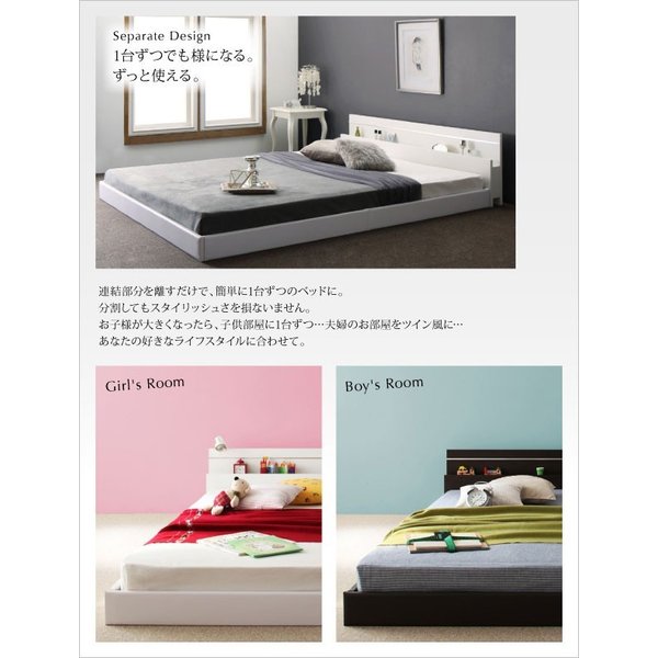 kag-40288 連結ベッド 幅190 キング ワイド 3人 4人 家族 つなげる 2台 分割 ファミリー マットレス付き ロー 低い 宮 棚 携帯 収納 照明 ライト コンセント スマホ 充電