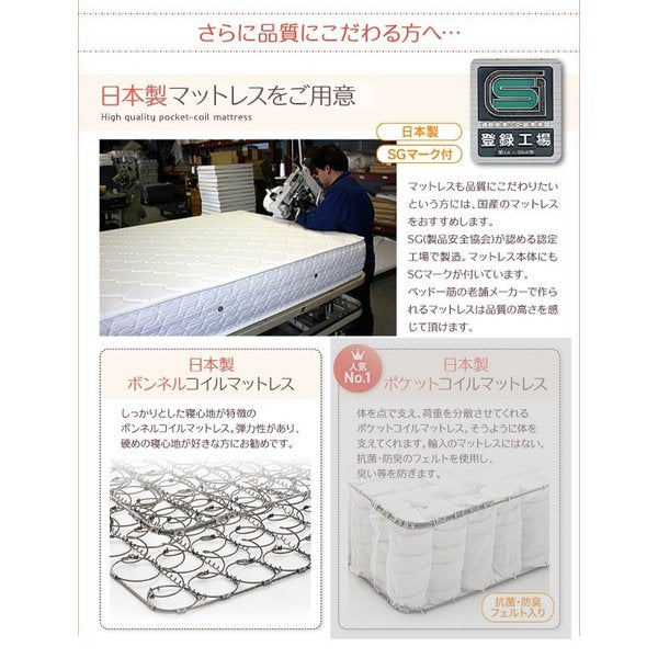 2.1mmコイルスプリング(コイル数/SS:240 S:270 SD:330 D:390)、2.2mmコイルスプリング(コイル数/SS:88 S:92 SD:98 D:104)、ウレタン、フェルト、ポリエステル100%張地、両面多針キルティング加工
