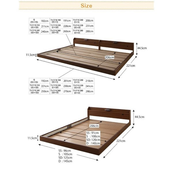 kag-45009 連結ベッド 幅230 キング ワイド 3人 4人 家族 つなげる 2台 分割 ファミリー マットレス付 ロー 低い ロング 棚 携帯 収納 照明 ライト コンセント スマホ 充電