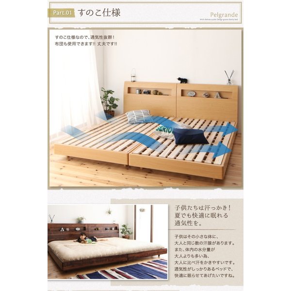 kag-45231 連結ベッド 幅280 キング ワイド 3人 4人 家族 つなげる 2台 分割 ファミリー マットレス付 ロー 低い 棚 携帯 収納 コンセント スマホ すのこ 通気性 脚 北欧