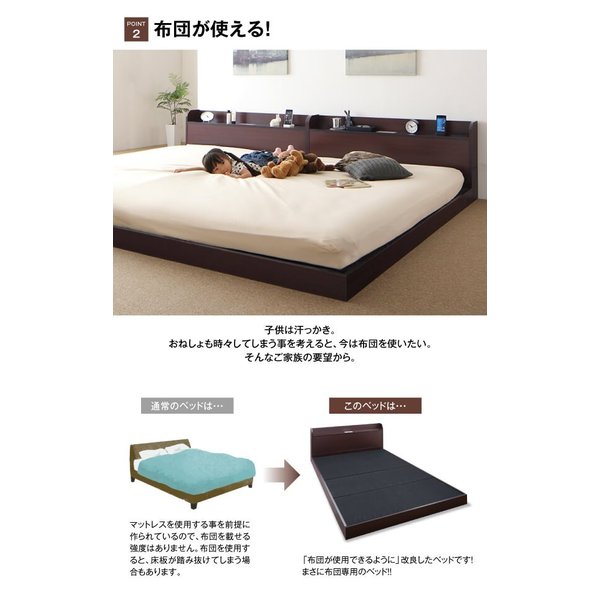 kag-45279 連結ベッド 幅200 キング ワイド 3人 4人 家族 つなげる 2台 分割 ファミリー フレーム ロー 低い 宮 棚 携帯 収納 コンセント スマホ 充電 布団可 フラット床板