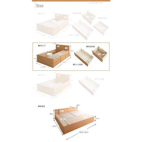 Aタイプ:浅型引き出し/55×38×12cm、深型引き出し/55×38×26cm、フット引き出しS:89×59×22cm、SD:108×59×22cm