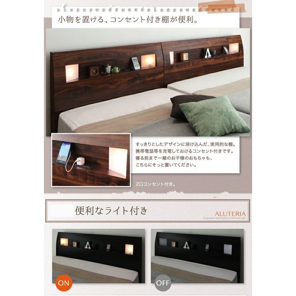 kag-45441 連結ベッド 幅280 キング ワイド 3人 4人 家族 つなげる 2台 分割 ファミリー フレーム ロー 低い 棚 携帯 収納 照明 ライト コンセント スマホ すのこ 脚