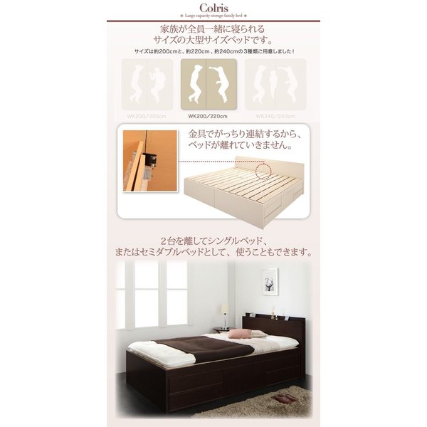 kag-45519 連結ベッド 幅220 キング ワイド 3人 4人 家族 つなげる 2台 分割 ファミリー フレーム チェスト 収納 引き出し 棚 携帯 コンセント スマホ すのこ 通気性 カビ
