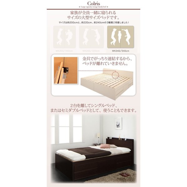 kag-45520 連結ベッド 幅240 キング ワイド 3人 4人 家族 つなげる 2台 分割 ファミリー フレーム チェスト 収納 引き出し 棚 携帯 コンセント スマホ すのこ 通気性 カビ
