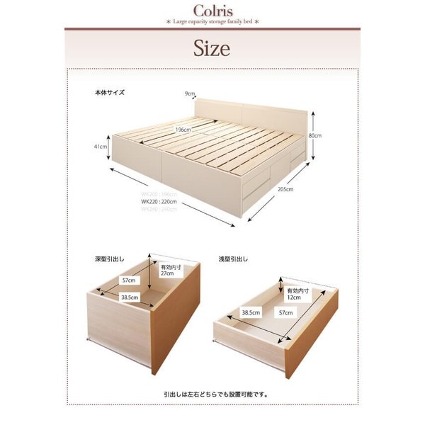 kag-45522 連結ベッド 幅220 キング ワイド 3人 4人 家族 つなげる 2台 分割 ファミリー フレーム チェスト 収納 引き出し 棚 携帯 コンセント スマホ すのこ 通気性 カビ