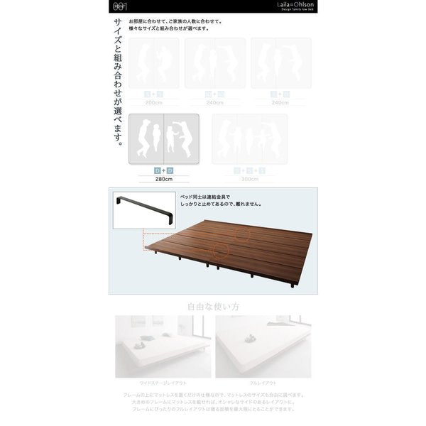 連結ベッド 幅280 キング ワイド 2人 3人 4人 家族 つなげる 2台 連結 分割 ファミリー 親子 フレームのみ ローベッド ロータイプ フロア 低床 低い ロングサイズ ヘッドレス ヘッドボードなし 布団 直置き マットレス不要 フラット床板 土台 脚付き 足付 ルンバ 北欧 おしゃれ モダン アンティーク