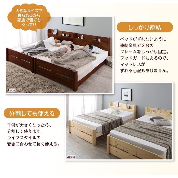 kag-49053 連結ベッド 幅260 キング ワイド 3人 4人 家族 つなげる 2台 分割 ファミリー マットレス付 ロー 低い 高さ調節 棚 携帯 収納 スマホ コンセント すのこ 通気性