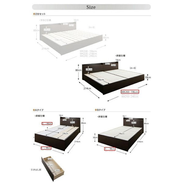 kag-51535 連結ベッド 幅200 キング ワイド 3人 4人 家族 つなげる 2台 分割 ファミリー マットレス付 チェスト 引き出し 高い 床下 収納 全面 棚 携帯 コンセント スマホ