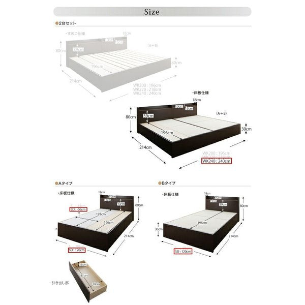 kag-51560 連結ベッド 幅240 キング ワイド 3人 4人 家族 つなげる 2台 分割 ファミリー マットレス付 チェスト 引き出し 高い 床下 収納 全面 棚 携帯 コンセント スマホ