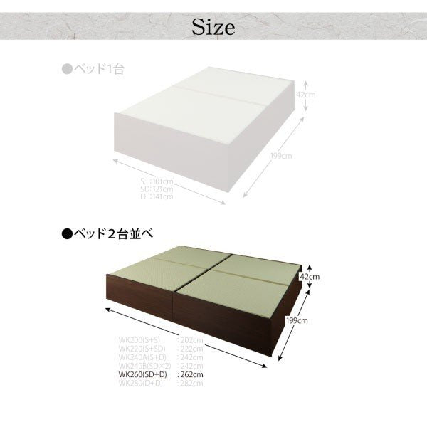 連結ベッド 幅260 キング ワイド 2人 3人 4人 家族 つなげる 2台 連結 分割 ファミリー 親子 フレームのみ 日本製 国産 畳ベッド 硬め 布団対応 布団用 腰痛対策 通気性 除湿 カビ 湿気 和室 フラット床板 土台 箱型 ベッド下収納 収納付き 大容量 高い 床下収納スペース 全面収納 ヘッドレス ヘッドボードなし 布団 直置き マットレス不要 布団収納 アジアン 和モダン