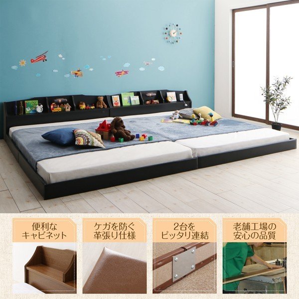kag-51872 連結ベッド 幅200 キング ワイド 3人 4人 家族 つなげる 2台 分割 ファミリー マットレス付き ロー 低い 宮 棚 携帯 収納 照明 ライト コンセント スマホ 充電