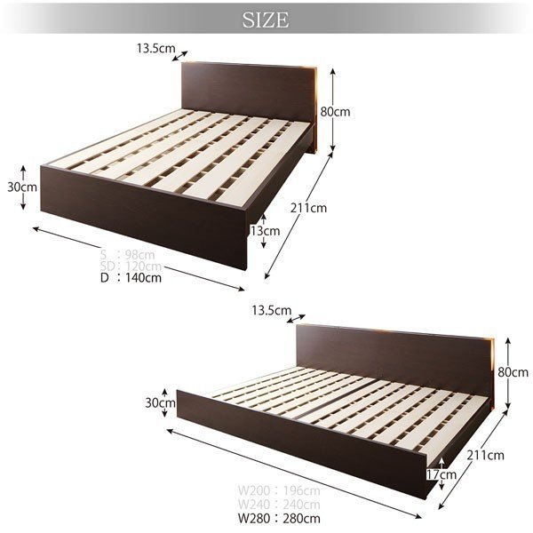kag-52479 連結ベッド 幅280 キング ワイド 3人 4人 家族 つなげる 2台 分割 ファミリー マットレス付 高さ調節 ロー 低い 棚 携帯 照明 ライト 携帯 スマホ コンセント