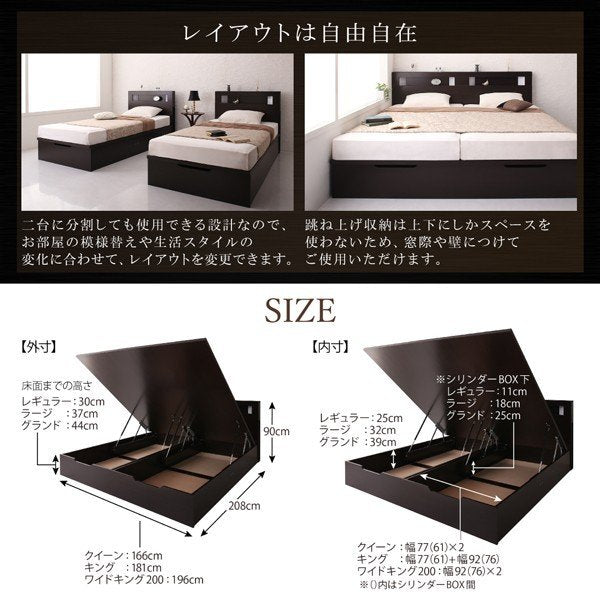 kag-52987 連結ベッド キング ワイド 3人 4人 家族 つなげる 2台 分割 ファミリー マットレス付 跳ね上げ式 ガス圧 ベッド下 収納 棚 携帯 照明 ライト コンセント スマホ