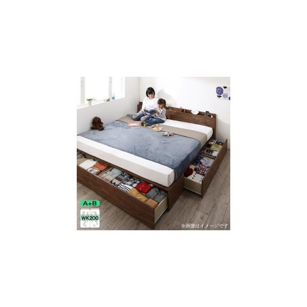 kag-53545 連結ベッド 幅200 キング ワイド 3人 4人 家族 つなげる 2台 分割 ファミリー マットレス付 チェスト 収納 引き出し 棚 携帯 コンセント スマホ 充電 ロー 低い