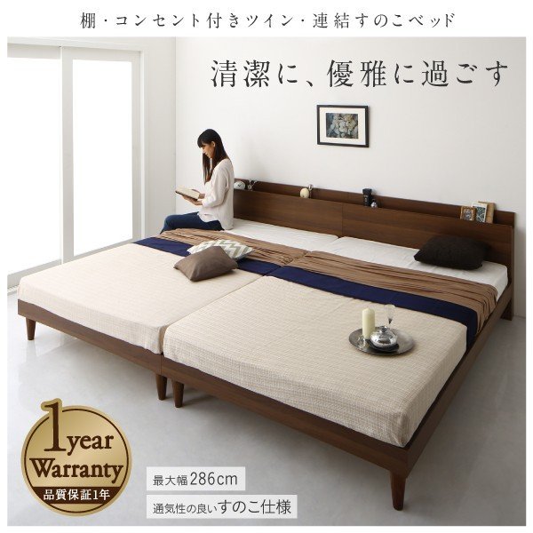 kag-54423 連結ベッド 幅260 キング ワイド 3人 4人 家族 つなげる 2台 分割 ファミリー マットレス付 ロー 低い 棚 携帯 収納 コンセント スマホ 布団可 すのこ 通気性 脚