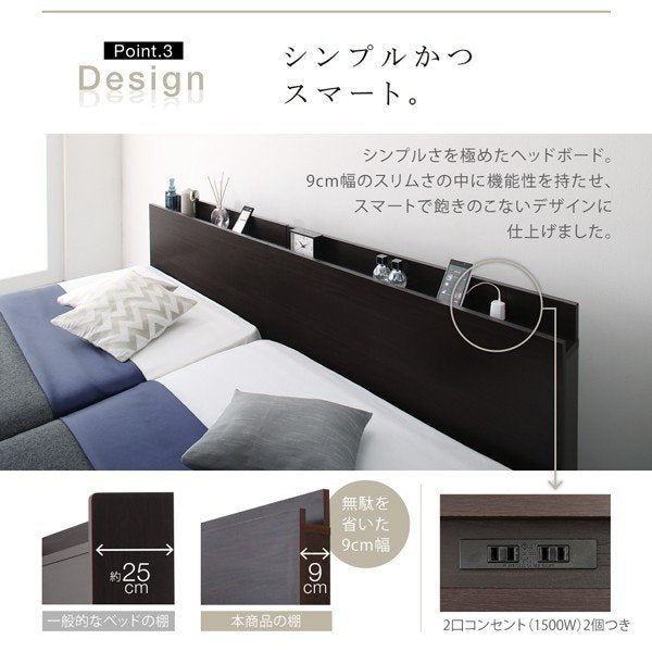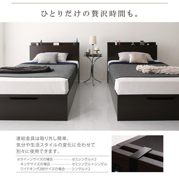 kag-52831 連結ベッド クイーン 2人 3人 家族 つなげる 2台 連結 分割 ファミリー マットレス付 跳ね上げ式 ガス圧 ベッド下 収納 大容量 棚 携帯 コンセント スマホ 充電