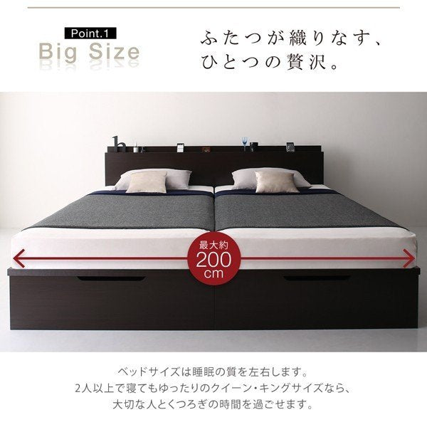 kag-52847 連結ベッド クイーン 2人 3人 家族 つなげる 2台 連結 分割 ファミリー マットレス付 跳ね上げ式 ガス圧 ベッド下 収納 大容量 棚 携帯 コンセント スマホ 充電