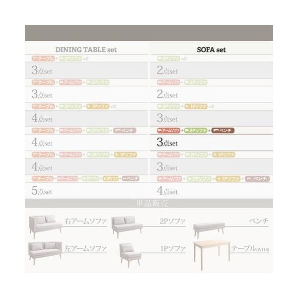 当商品は3点(2Pソファ1脚+肘ソファ1脚+ベンチ1脚)右肘