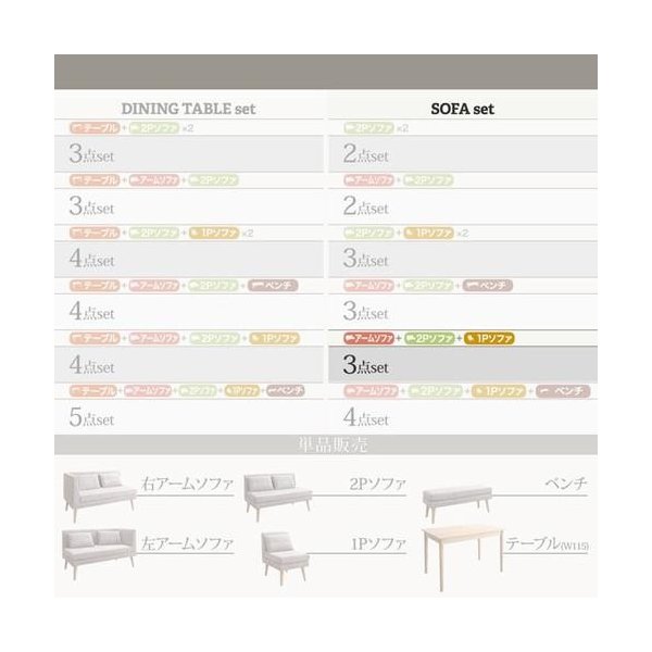当商品は3点(2Pソファ1脚+肘ソファ1脚+1Pソファ1脚)右肘