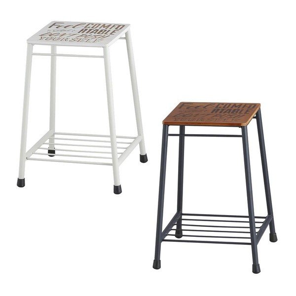 金属と木材を組み合わせたシンプルなサイドテーブルです。くつろいで、無理しないでという意味の言葉がプリントされています。