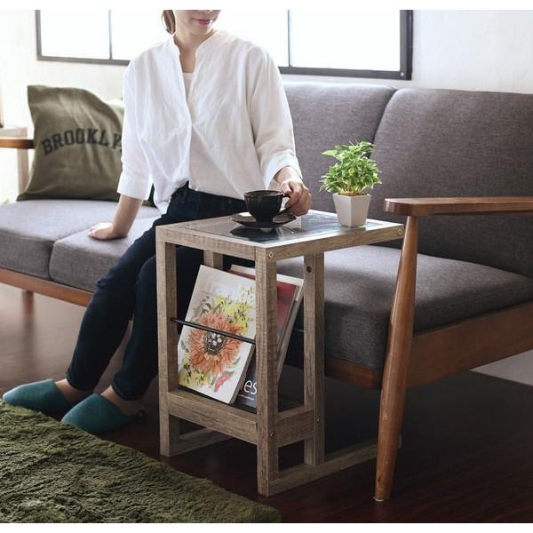 優しい色調で味わい深い古木風シートと美しい強化ガラスを組み合わせたデザインが、お部屋全体にすっきりとした印象を与えるサイドテーブル。圧迫感のないシンプルなデザインは、お気に入りの小物や観葉植物、ドライフラワーなどを一層際立たせてくれます。ソファに差し込める形なので、一息つけるくつろぎの時間にぴったり。ラック部分にはお好きな雑誌などを入れて、リラックスタイムを満喫してください。