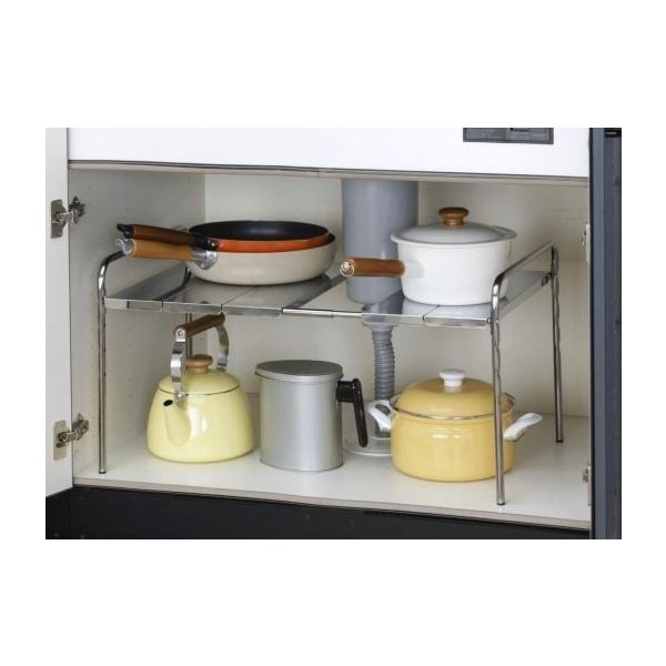 スペースに合わせて幅が調節でき、分割式棚板の採用により排水管を避けた設置が可能です。棚板はステンレス製ですのでサビにくく、お手入れもカンタン。湿気の多いシンク下にピッタリです。鍋類の収納に便利です。