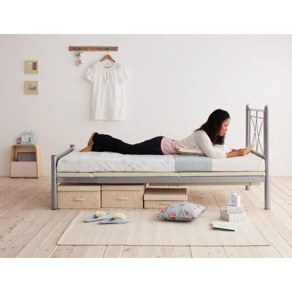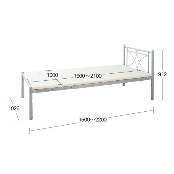 -ベッド 【サイズ】 幅:1600~2200×奥行1026×高さ912mm 床板面高:325/465mm 床下高:240/380mm 【素材】 ベッドフレーム:鋼管、粉体塗装 床板:合板/上張り布:ポリエステル100% 布製ポケット/綿100% 【カラー】シルバー 【耐荷重】約100kg 【商品重量/梱包重量】約34.6kg/約36.6kg 【梱包サイズ】約幅1560×幅1060×高さ115mm *お客様組立品、六角レンチ付き