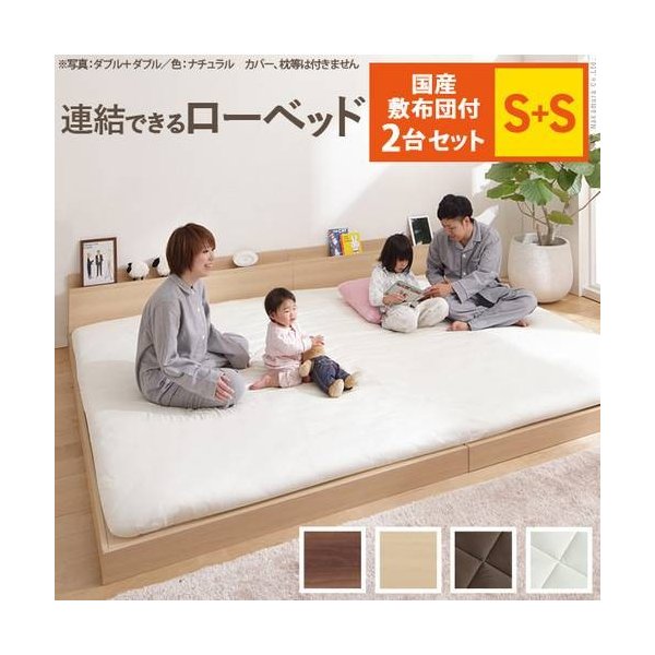 kag-36162 連結ベッド 幅200 キング ワイド 2人 3人 4人 ローベッド 布団 セット 家族 シングル 連結 分割 同色2台 +敷布団付 ファミリー 親子 宮付き コンセント 布団付き