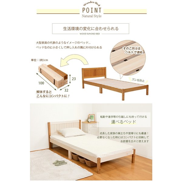 コンパクトに分解できる木製シングルベッド。コイルマットレスでも布団でも使用可。
