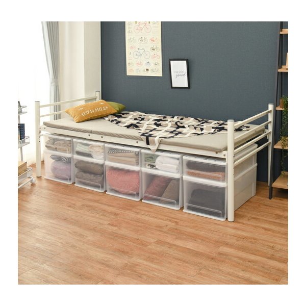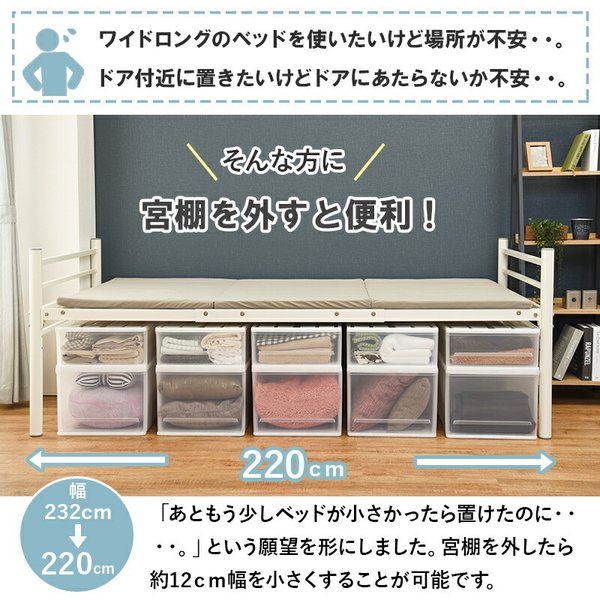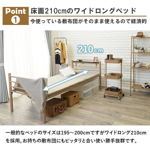 敷布団がそのまま使えるワイドロングサイズ。宮棚が取り外せてカラーが豊富なオシャレなベッドです。