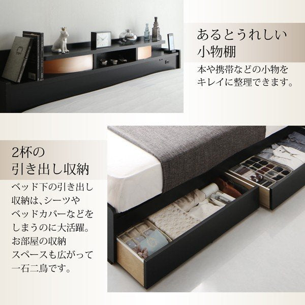 シングルベッド 一人暮らし マットレス付き チェストベッド ミドル ベッド下収納 引き出し付き 大容量 ロングサイズ 宮付き ヘッドボード 枕元 棚 ラック 携帯置き ティッシュ置き メガネ置き リモコン 頭上 収納 照明 読書灯 ライト 読書 電気 コンセント ゲーム ケーブル スマホ 充電 デザイナーズ ホテル モダン 高級 メンズ