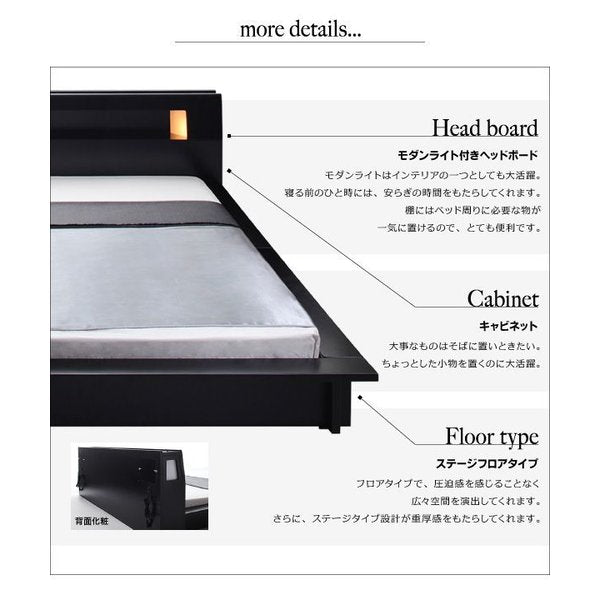 シングルベッド 一人暮らし フレームのみ ローベッド ロータイプ フロア 低床 低い 宮付き ヘッドボード 枕元 棚 ラック 携帯置き ティッシュ置き メガネ置き リモコン 頭上 収納 照明 読書灯 ライト 読書 電気 コンセント ゲーム ケーブル スマホ 充電 デザイナーズ ホテル モダン 高級 メンズ