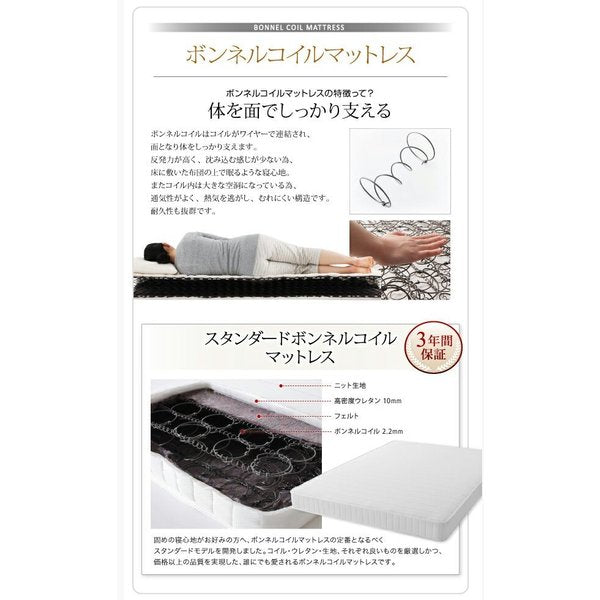 ※ベッドのフレームはスプリングマットレス使用時の基準で強度計算されております。 そのため、床板に直接布団などを敷いてご利用になりますと破損の原因となる場合があり、大変危険です。床板の上に必ずスプリングマットレスを敷いてご利用ください。