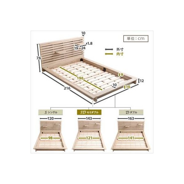 kag-27291 ベッド セミダブル ローベッド 低い 宮 棚 スマホ メガネ リモコン ラック フレーム フラット 薄型 板 すのこ コンセント 充電 北欧 おしゃれ ヴィンテージ