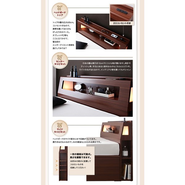 セミダブルベッド 一人暮らし SD マットレス付き 跳ね上げ式ベッド ガス圧 ベッド下 収納付き 大容量 宮付き ヘッドボード 枕元 棚 ラック 携帯置き ティッシュ置き メガネ置き リモコン 頭上 収納 照明 読書灯 ライト 読書 電気 コンセント ゲーム ケーブル スマホ 充電 ヴィンテージ メンズ モダン レトロ