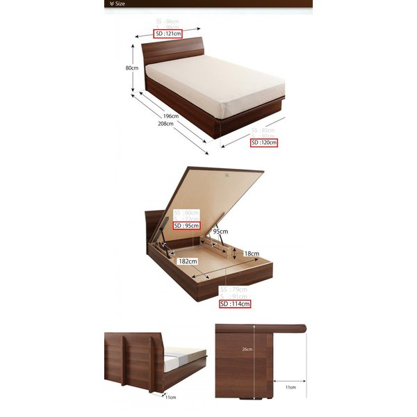 セミダブルベッド 一人暮らし SD マットレス付き 跳ね上げ式ベッド ガス圧 ベッド下 収納付き 大容量 フラットヘッドボード 薄型 ヴィンテージ メンズ モダン レトロ