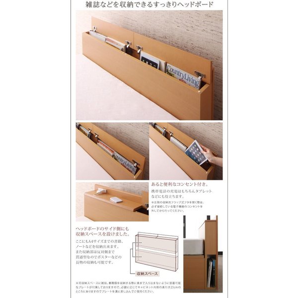セミダブルベッド 一人暮らし SD マットレス付き 跳ね上げ式ベッド ガス圧 ベッド下 収納付き 大容量 宮付き ヘッドボード 枕元 棚 ラック 携帯置き ティッシュ置き メガネ置き リモコン 頭上 収納 コンセント ゲーム ケーブル スマホ 充電 電気 デザイナーズ ホテル モダン 高級 メンズ