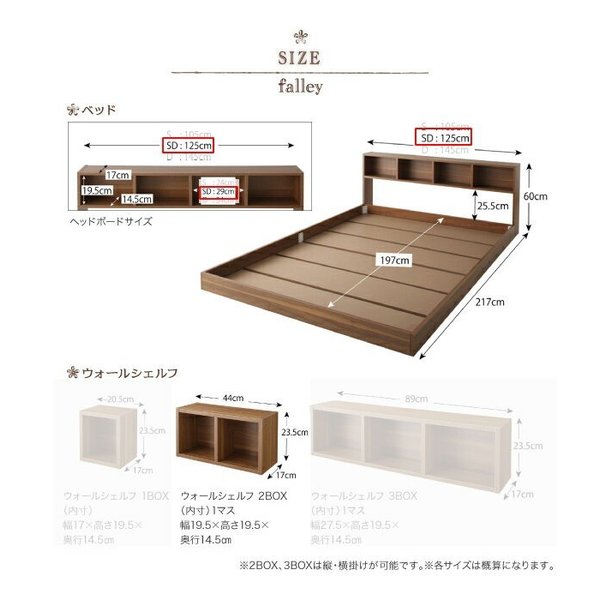 ベッドフレームのみ ウォールシェルフ2BOX セミダブル