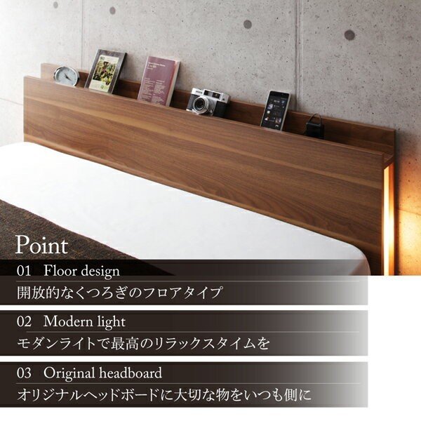 セミダブルベッド 一人暮らし SD マットレス付き ローベッド ロータイプ フロア 低床 低い 宮付き ヘッドボード 枕元 棚 ラック 携帯置き ティッシュ置き メガネ置き リモコン 頭上 収納 照明 読書灯 ライト 読書 電気 コンセント ゲーム ケーブル スマホ 充電 ヴィンテージ メンズ モダン レトロ