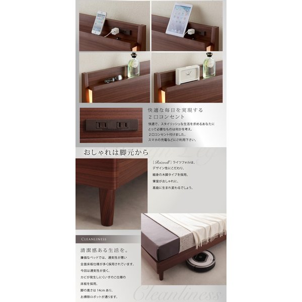 kag-43470 セミダブルベッド 一人暮らし フレームのみ 脚 足 宮 棚 携帯 リモコン 収納 照明 読書 ライト 電気 コンセント スマホ 充電 すのこ 通気性 カビ ヴィンテージ