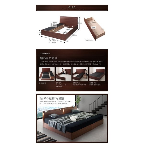 kag-43497 セミダブルベッド 一人暮らし SD フレームのみ チェスト ベッド下 収納 引き出し 大容量 宮 棚 携帯 リモコン 照明 読書灯 ライト 電気 コンセント スマホ 充電