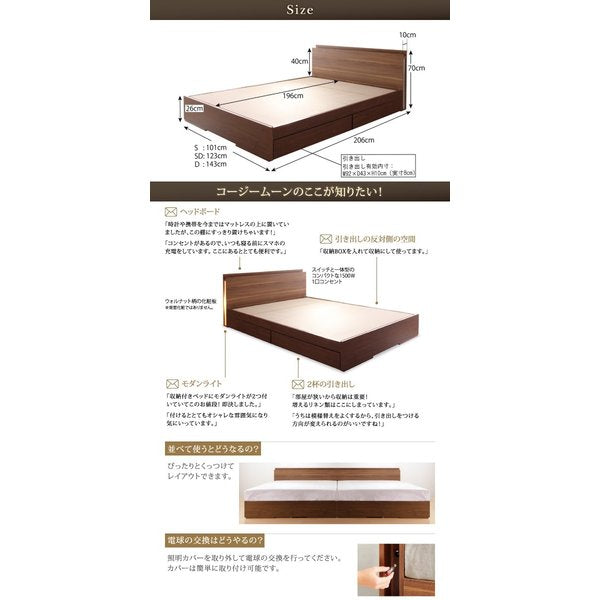 kag-43658 セミダブルベッド 一人暮らし SD マットレス付き チェスト ベッド下 収納 引き出し 大容量 宮 棚 携帯 リモコン 照明 読書 ライト 電気 コンセント スマホ 充電
