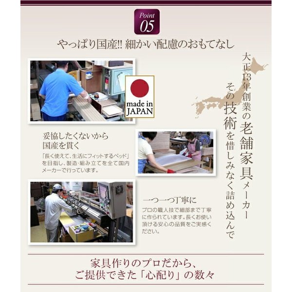 ※ベッドのフレームはスプリングマットレス使用時の基準で強度計算されております。そのため、床板に直接布団などを敷いてご利用になりますと破損の原因となる場合があり、大変危険です。床板の上に必ずスプリングマットレスを敷いてご利用ください。