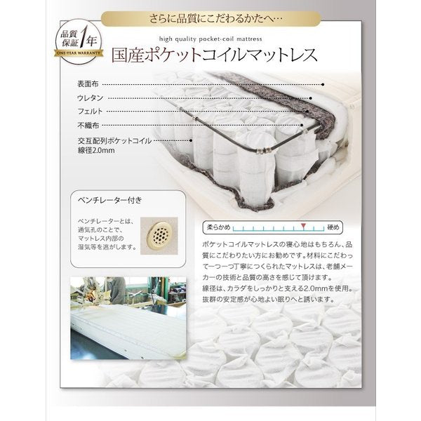 ※ベッドのフレームはスプリングマットレス使用時の基準で強度計算されております。そのため、床板に直接布団等を敷いてご利用になりますと破損の原因となる場合があり、大変危険です。こちらの商品フレームをご使用になる場合は、床板の上に必ずスプリングマットレスを敷いてご利用ください。