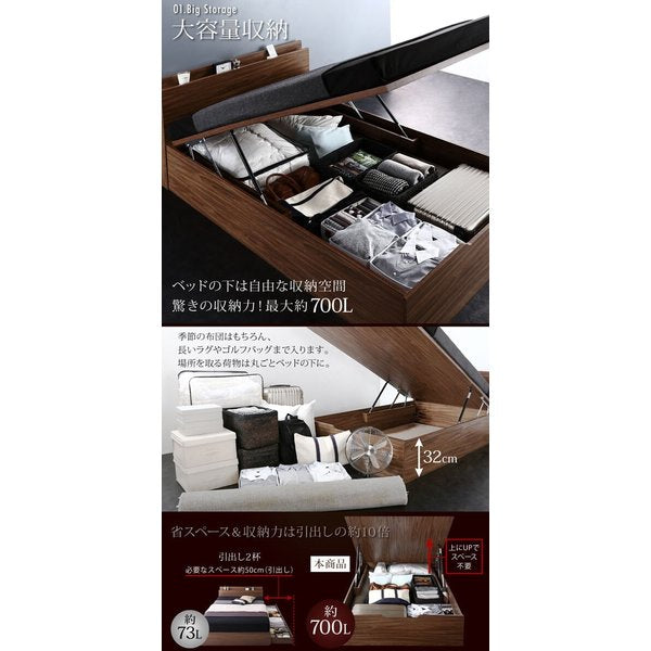 セミダブルベッド 一人暮らし SD マットレス付き 跳ね上げ式ベッド ガス圧 ベッド下 収納付き 大容量 宮付き ヘッドボード 枕元 棚 ラック 携帯置き ティッシュ置き メガネ置き リモコン 頭上 収納 コンセント ゲーム ケーブル スマホ 充電 電気 ヴィンテージ メンズ モダン レトロ